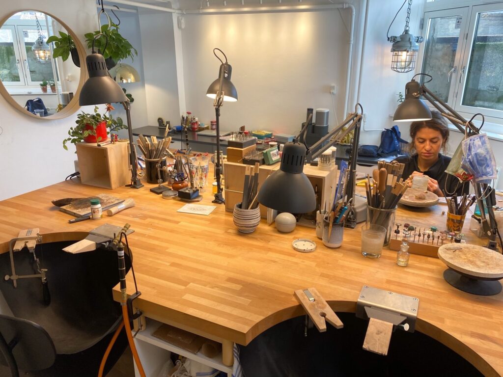 Du får din egen plads med skuffer og opbevaring ved det store, fælles guldsmedebord.