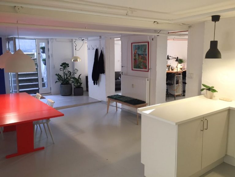 Værkstedet ligger i en høj og lys kælder centralt på Frederiksberg og med den smukke Landbohøjskolens Have som nærmeste nabo.