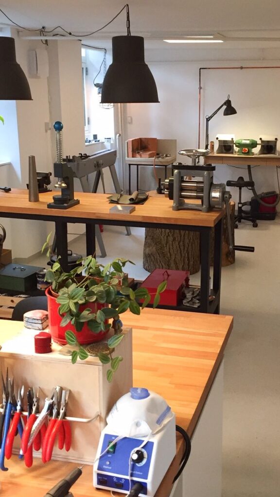 Du får din helt egen plads med skuffer og opbevaring ved det store, fælles guldsmedebord.